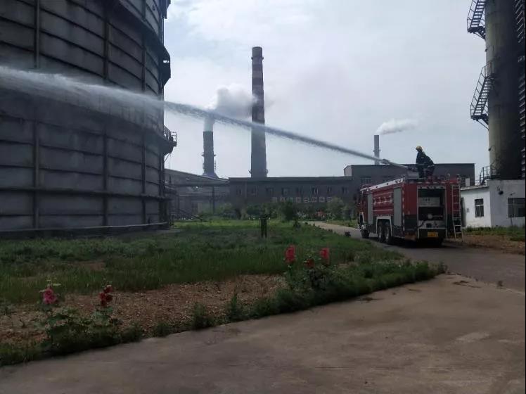 消防車進(jìn)入煤氣柜區(qū)域,在事故平臺(tái)下方準(zhǔn)備救援。