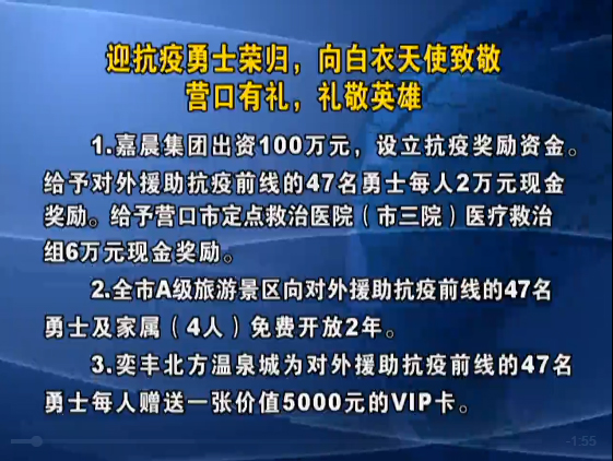 嘉晨集團(tuán)以體現(xiàn)大企業(yè)的責(zé)任與擔(dān)當(dāng),出資100萬元,設(shè)立抗疫獎勵資金。給予對外援助抗疫前線的47名勇士每人2萬元現(xiàn)金獎勵;給予營口市定點救治醫(yī)院(市三院)醫(yī)療救治組6萬元現(xiàn)金獎勵。以此表達(dá)對抗疫英雄的崇高敬意和無限愛戴。